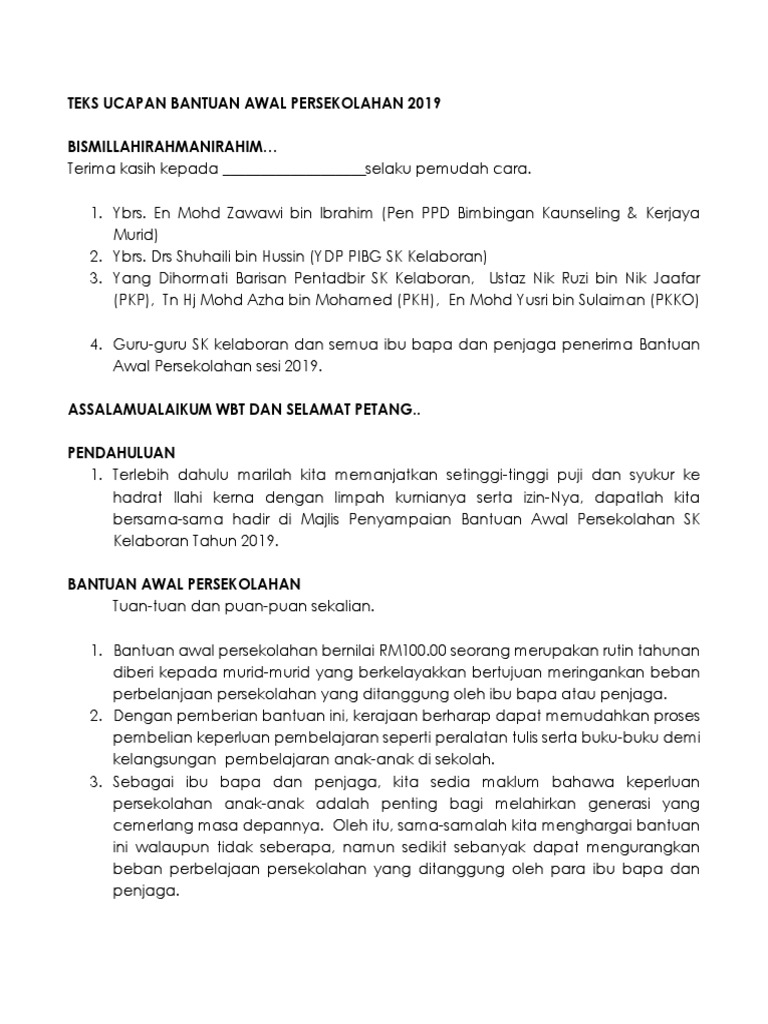 Teks Ucapan Bantuan Awal Persekolahan 2019 Pdf